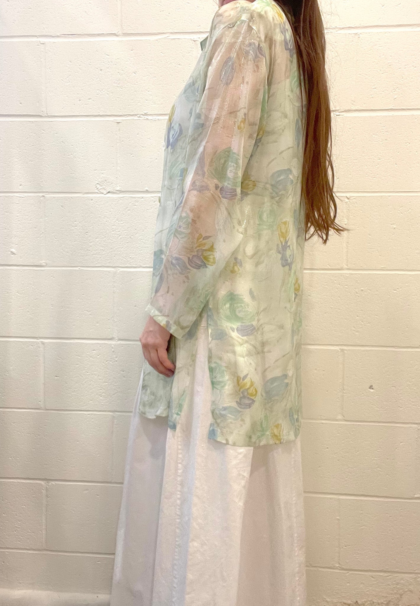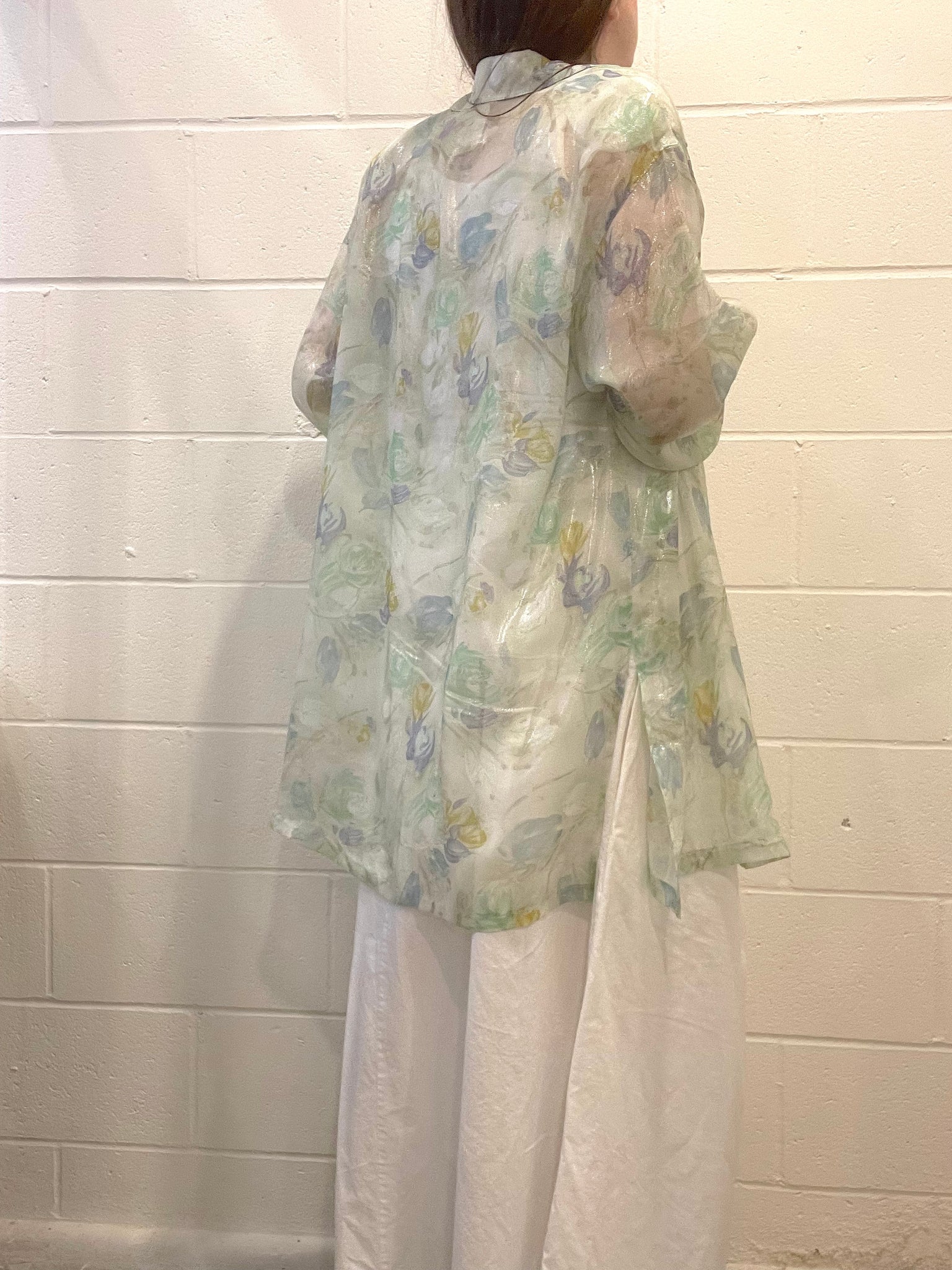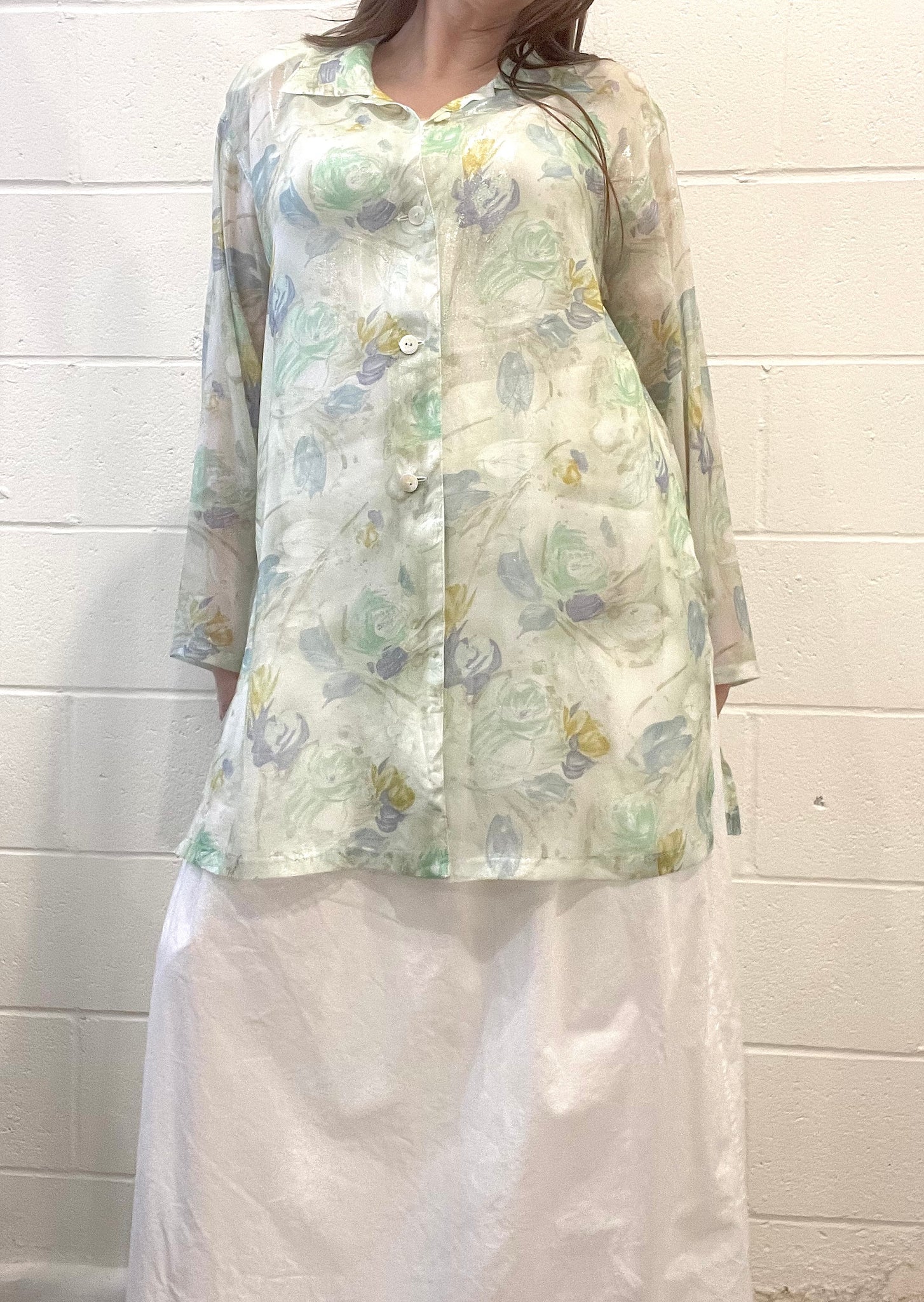 70's Pale Blue/Green Japanese BlouseButton front closureCollared necklineSemi-sheerMade in Japan